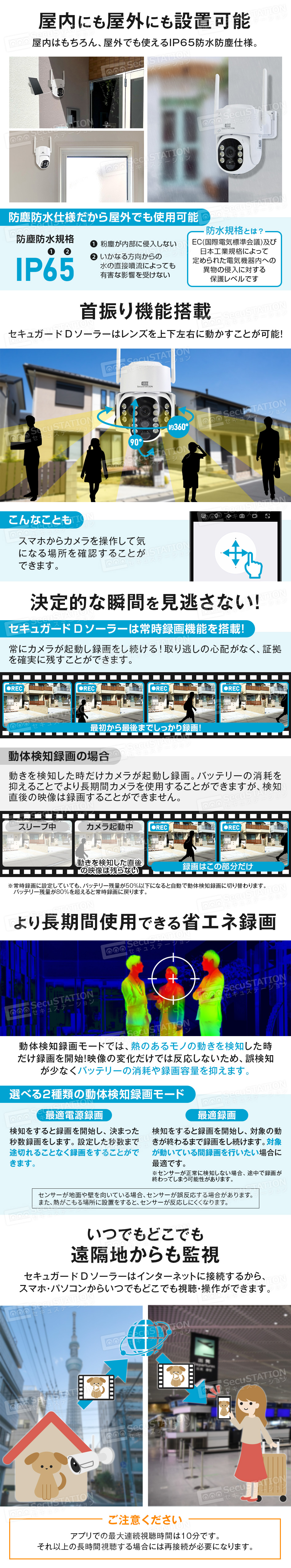 | 録画方式 | 検知録画/常時録画(常時録画はバッテリー残量が50%以上の間のみ可能) |